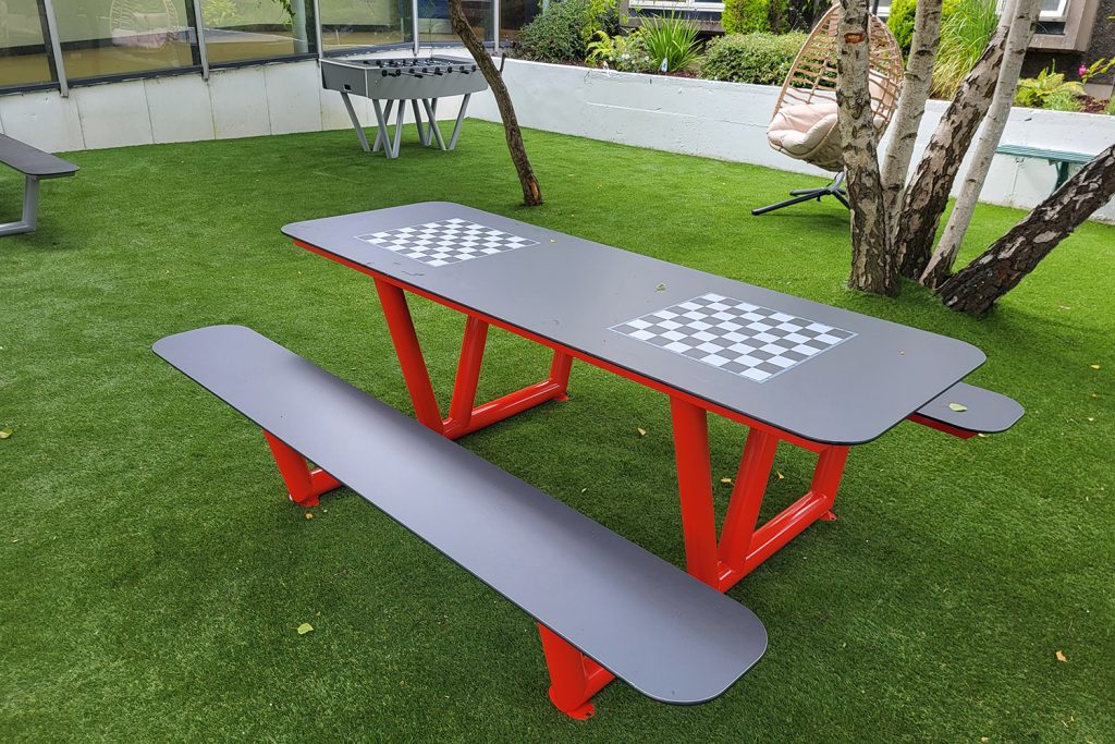 Zewnętrzne piłkarzyki (SOCCER) oraz wielofunkcyjne stoły PICNIC z opcją nadruku plansz do szachów czy warcabów. To produkty, które zamieniają zwykły skwer w społeczne centrum aktywności, odporne na uszkodzenia mechaniczne.